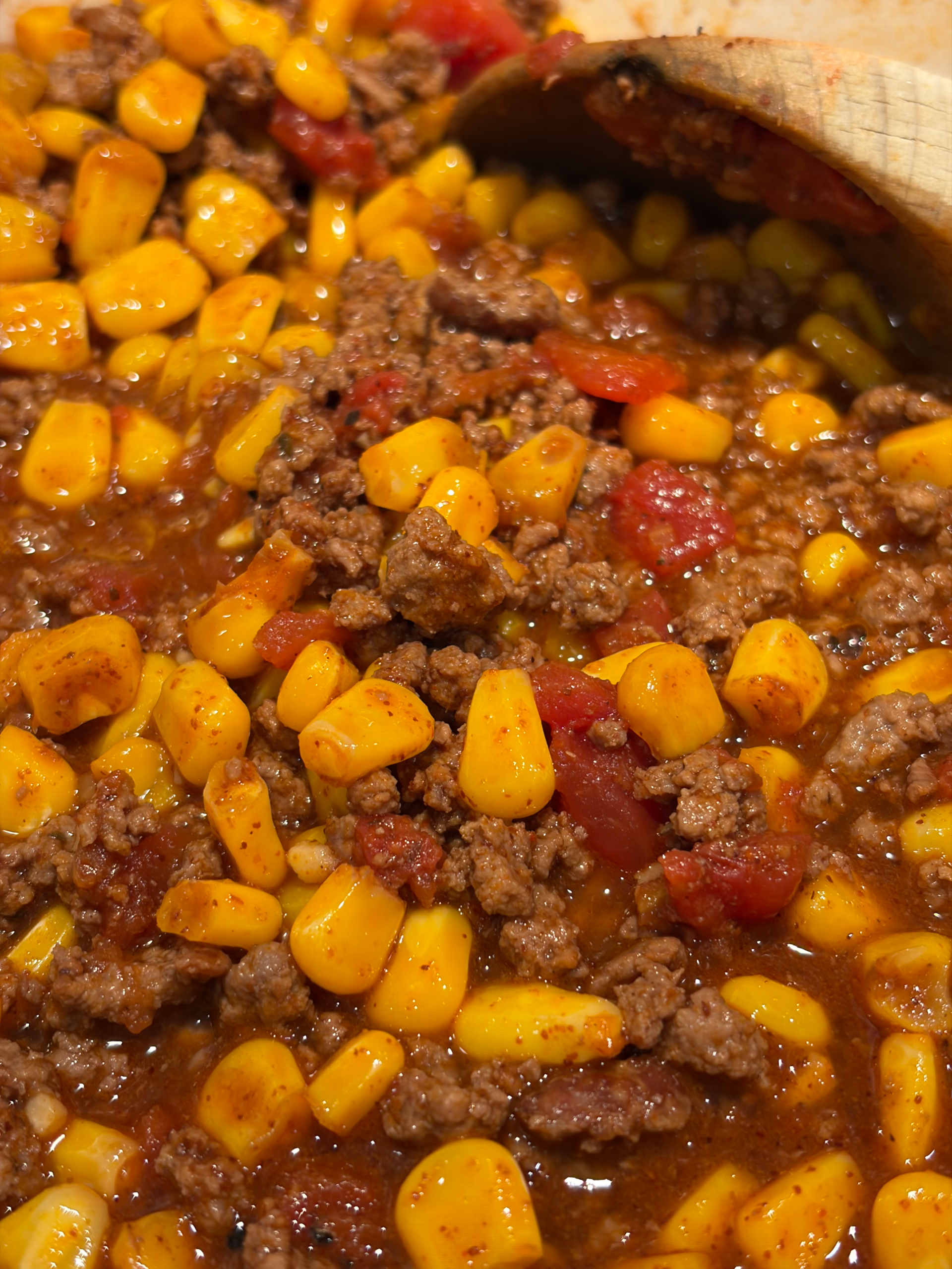 - Add tomatoes, garlic, corn, and chicken stock, stirring to combine.